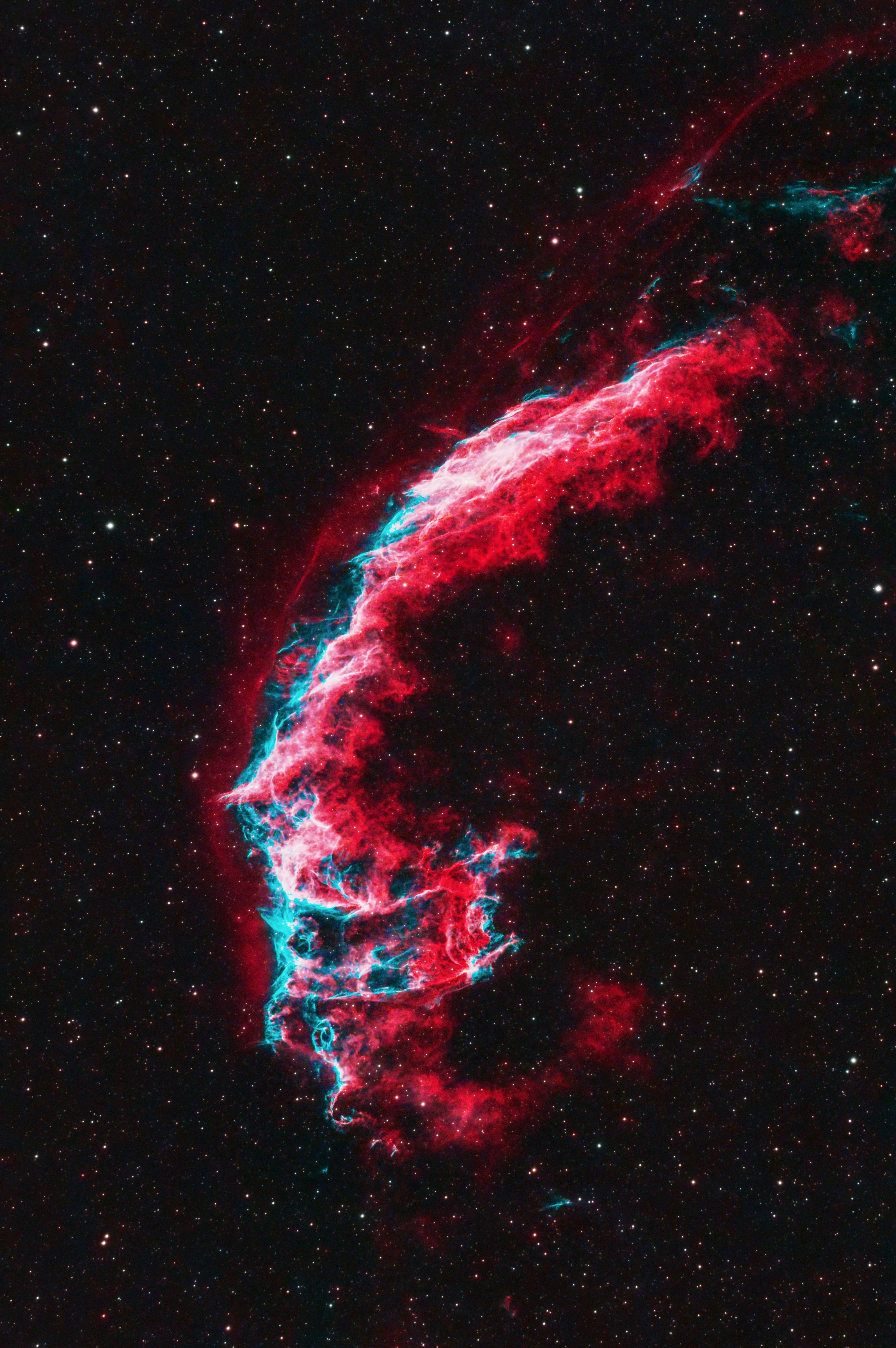 Here's 18 hours worth of 5-minute exposures on the Eastern veil nebula from a Bortle 7, in the constellation Cygnus which Taha rightfully describes as goated. The gear involved is a QHY183CC for the main camera, an HEQ5 Pro for the mount, a ZWO Electronic Autofocuser, SVBony guide camera and scope, an Antlia 5nm Dualband Hydrogen Alpha + Oxygen iii filter, and white monster for the operator.
