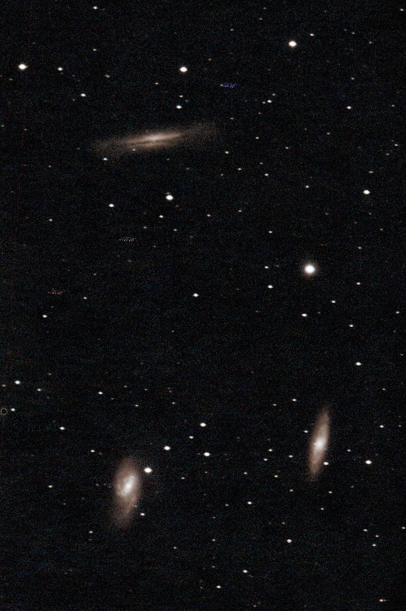 The Leo Triplet is comprised of three galaxies contained in the Leo constellation. Up top is the Hamburger Galaxy (NGC3628), bottom left is M66 and the bottom right is M65.